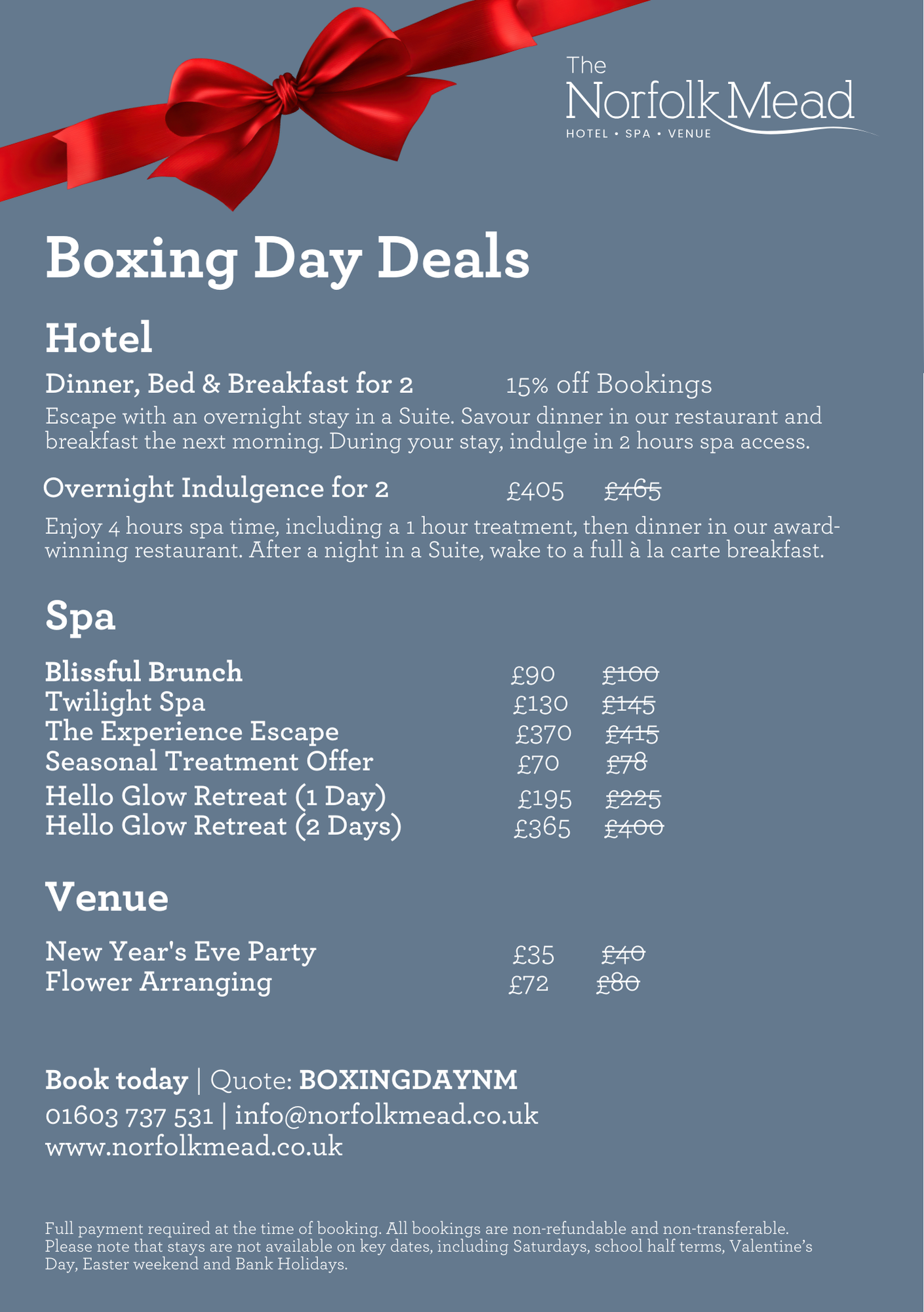 Take advantage of our Boxing Day Offers, which can be booked up until 31st March 2026. Bookings must be made before Friday 2nd January!