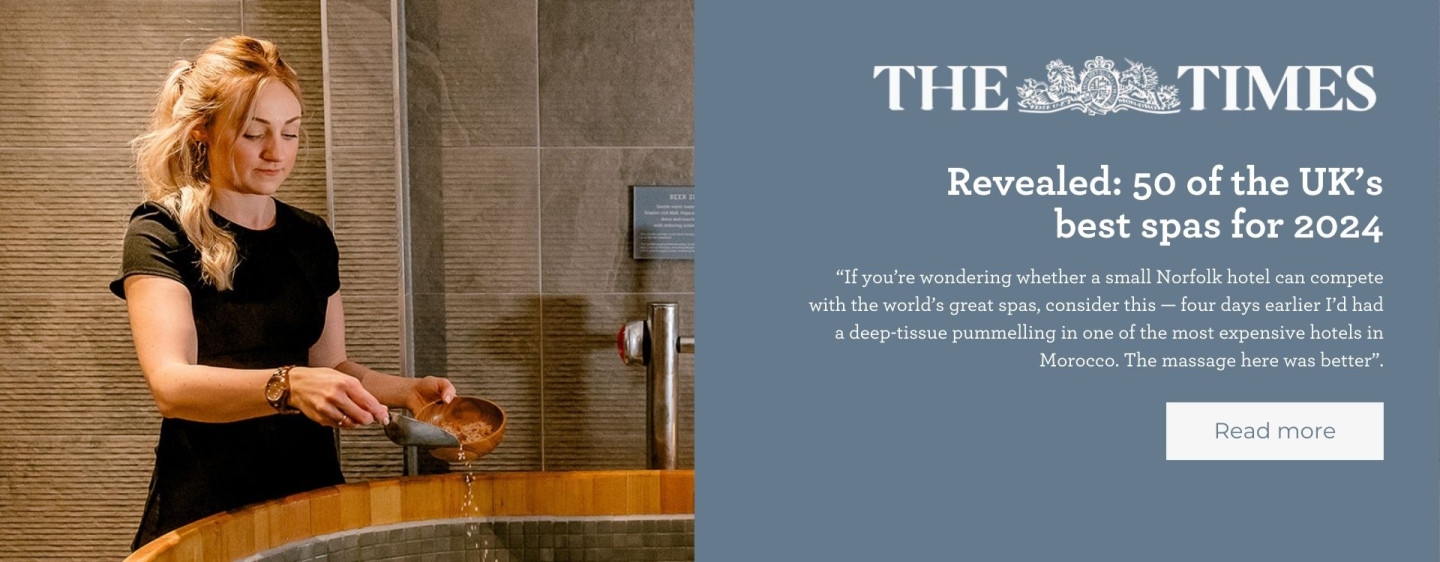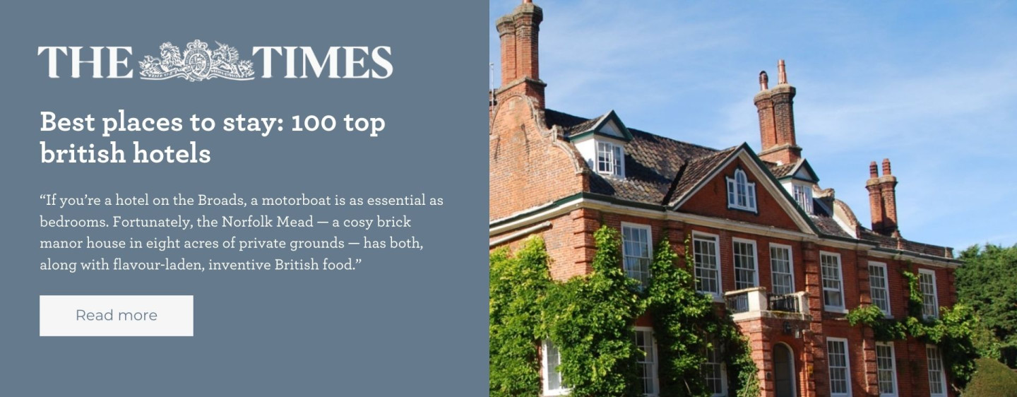 We are proud to be featured in The Times Top 100 Hotels along with The Times and Sunday Times Top UK Spa Days, both testaments to the quality and charm that we offer every visitor. Additionally, our fine dining restaurant has earned two prestigious AA Rosettes, and The Norfolk Mead itself holds the coveted AA Silver Award as a four-star Country House Hotel. From glowing reviews to in-depth features, we continue to attract praise for our hospitality, spa experiences, and dedication to excellence. Check out our media features below!