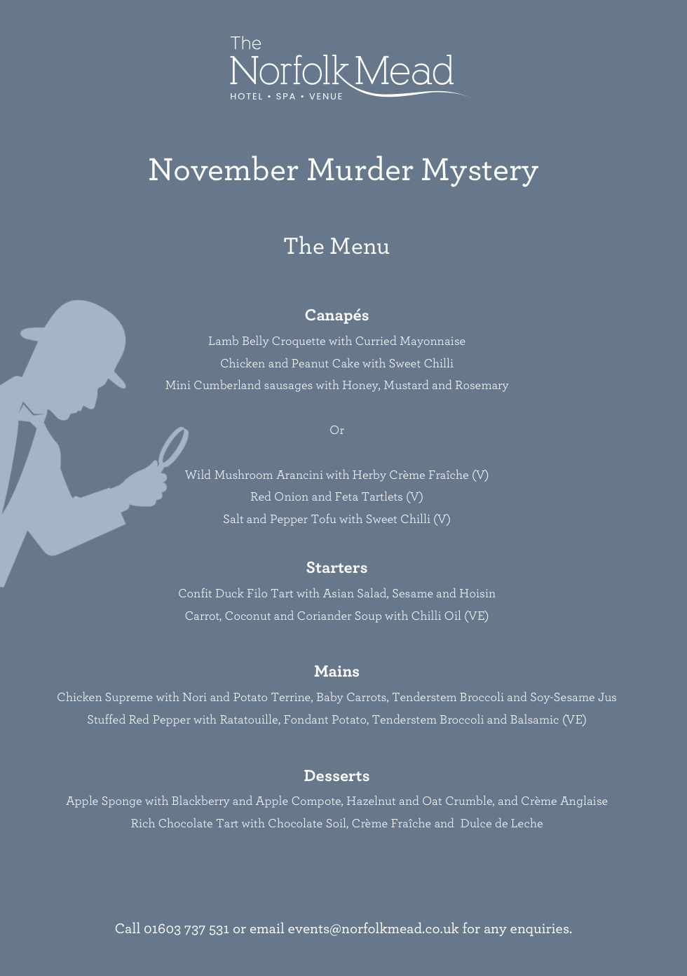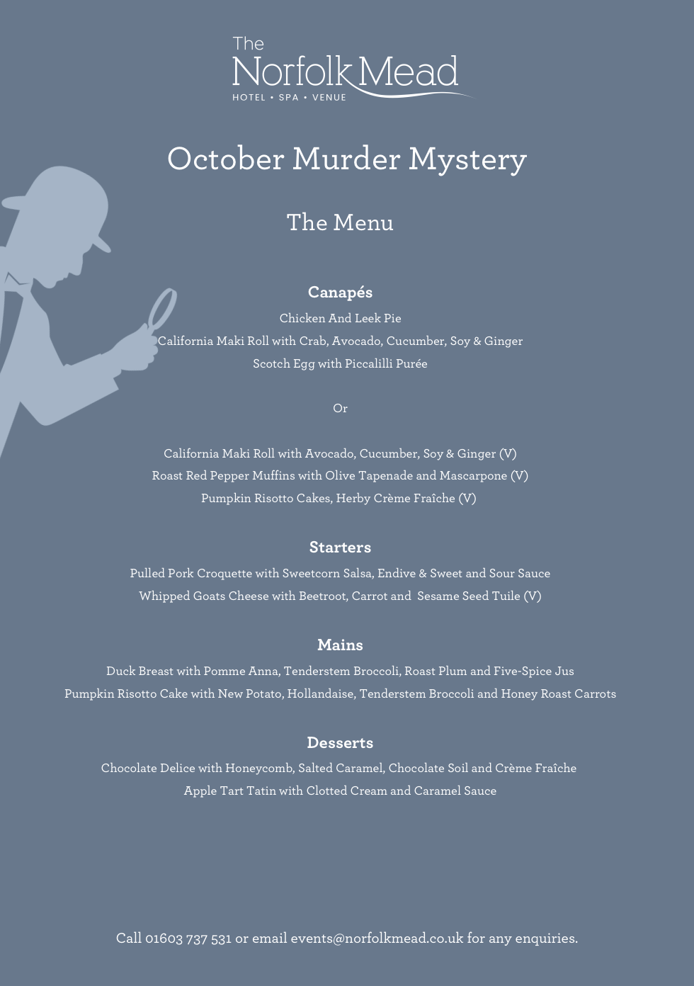 To book a space at our Murder Mystery event, please call 01603 737 531 or email events@norfolkmead.co.uk. Full payment is required upon booking. Please note that all payments are non-refundable.